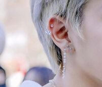 tattoos/piercings: 'no one like me" tattoo on inner right arm, tongue piercing. 8 ear piercings